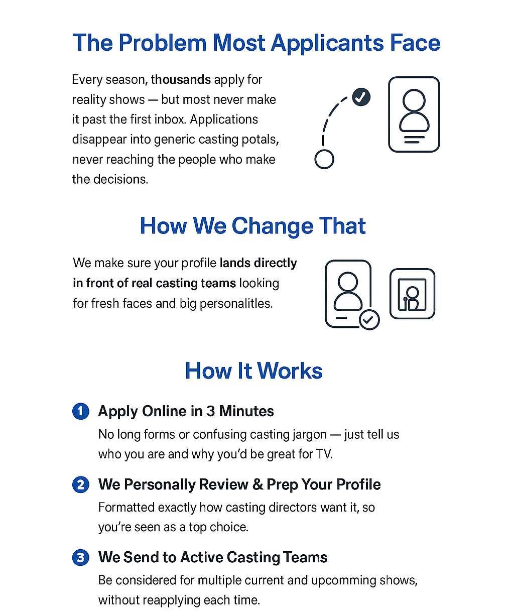 Apply Now — Before This Season’s Shows Are Locked Spots are limited. Once we reach our monthly casting cap, we close applications until the next cycle.